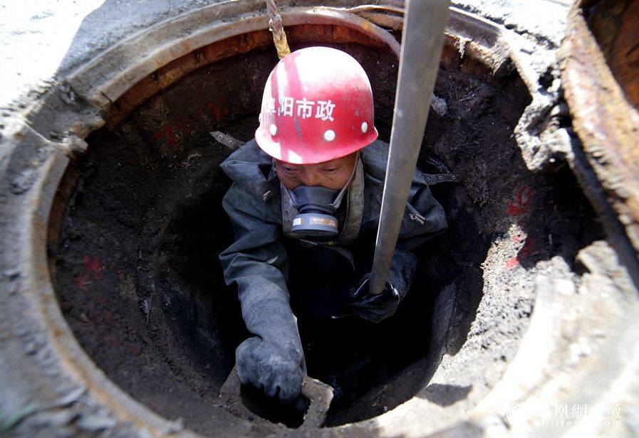 【“地下”工作者们】4月下旬的阜城,很多人都换上了夏装。有这么一群人,他们身披密不透风的橡胶衣、头盖安全帽、脸上罩着防毒面具,日日与又脏又臭的窨井相伴,为各条道路的下水道清除淤泥杂物,保障城市下水道的畅通,他们就是下水道清淤工人。图为李来友和队友们不断地在只能容下一人爬行的井口和管道中上下穿梭,疏通着城市的排水道。