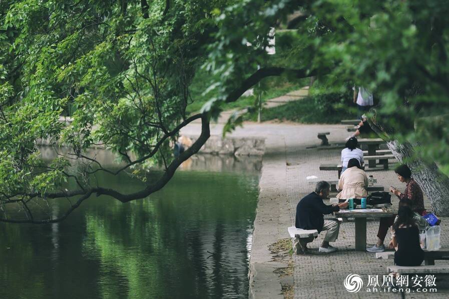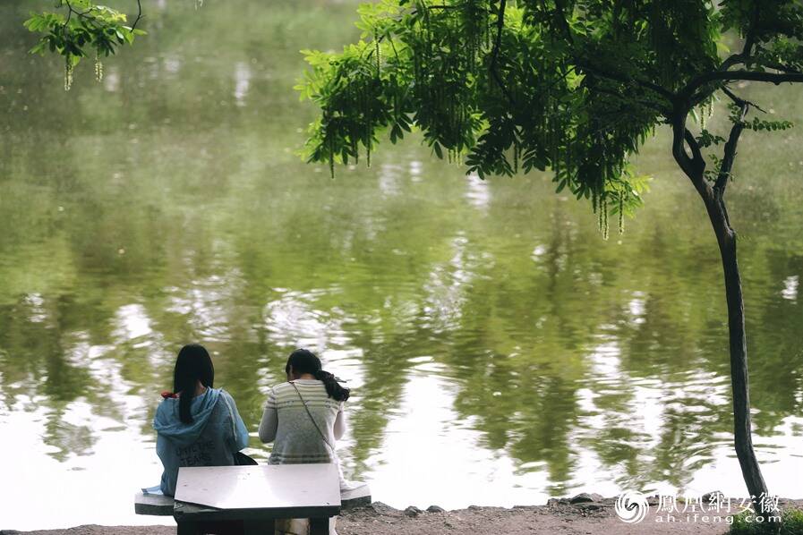 图为市民在安徽大学龙河校区眼镜湖边游玩。